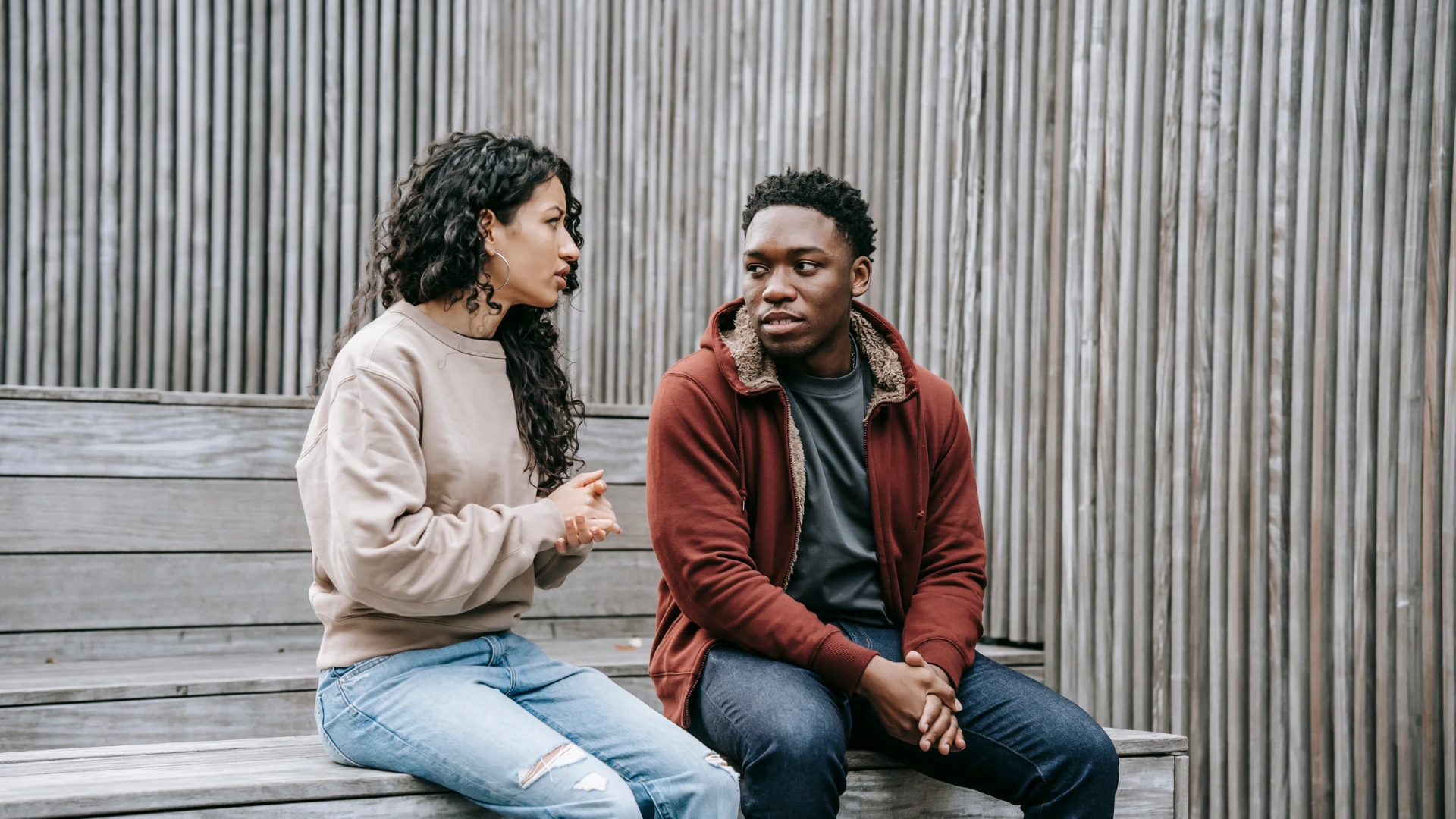 Une jeune femme parle à un homme assis sur un escalier en bois