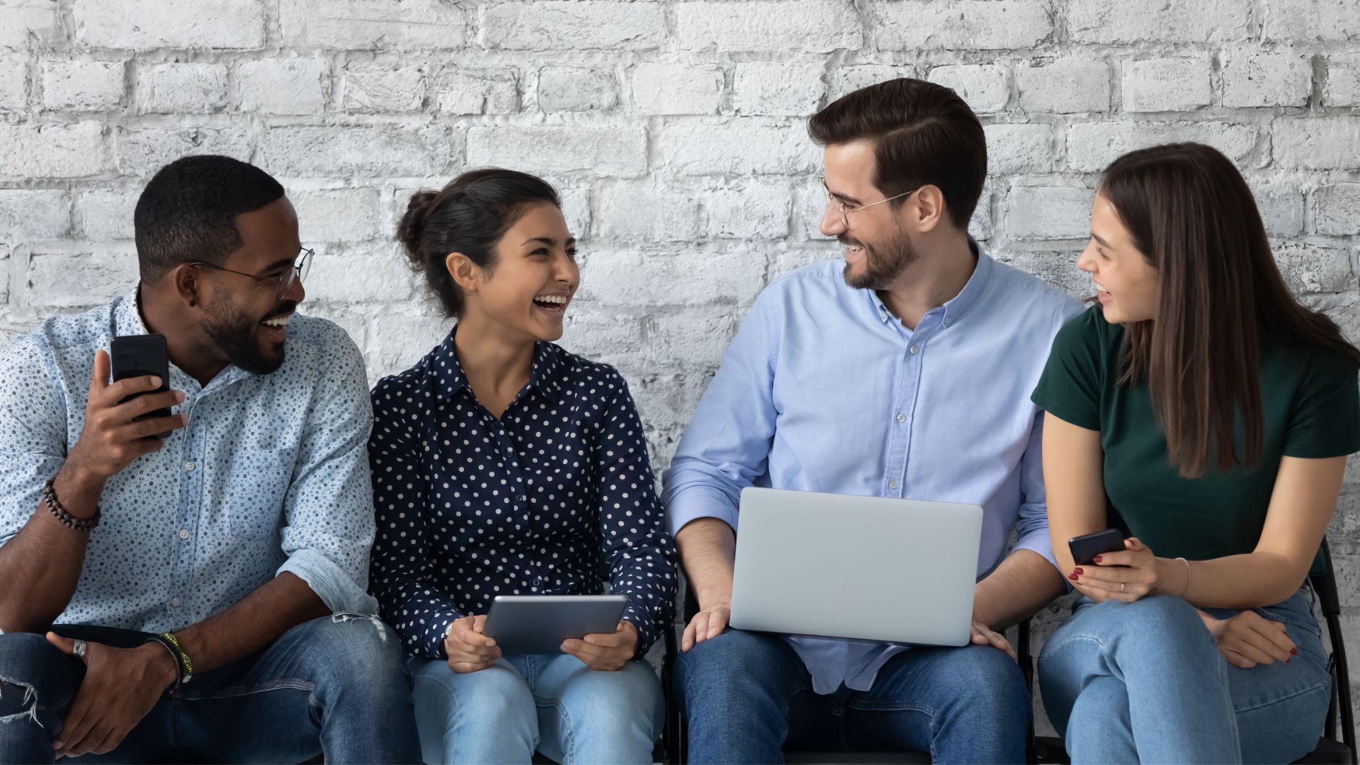 Quatre jeunes assis sur un banc contre un mur de briques blanches parlant et riant
