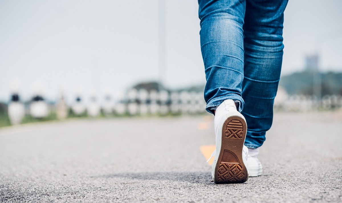 Home › Homepage › Close up woman wear jean and white sneaker walking forward on highway road in sunny day