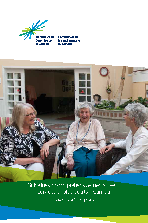 In the photo, we see three older women sitting together talking. Above appears the logo of the Mental Health Commission of Canada, a spark made up of blue and green lines. Below, we find the title of the report in white text over a green background, Mental Health Commission of Canada Seniors Guidelines - Executive Summary".