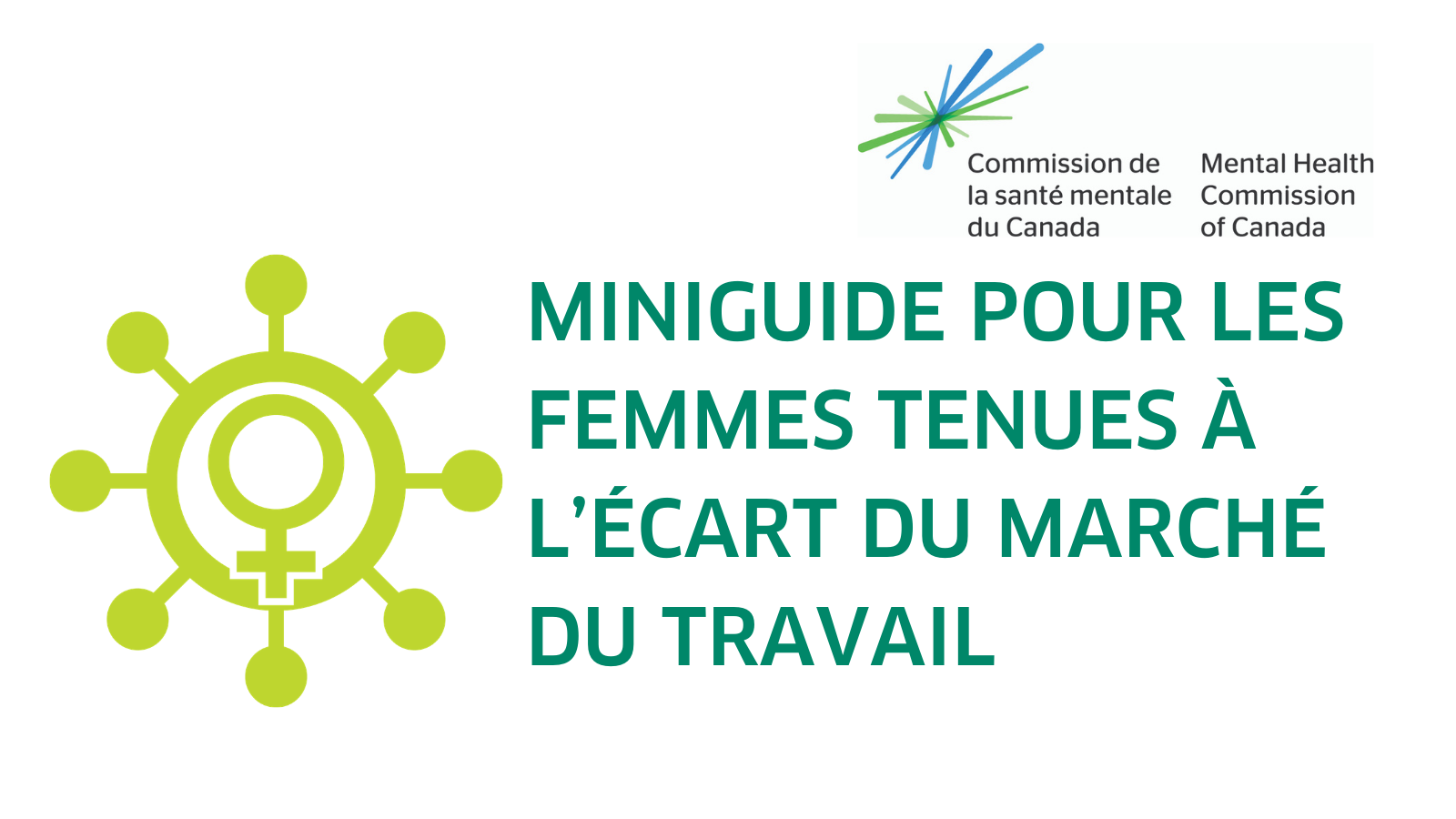 L’image a un fond blanc. À gauche, on trouve une icône jaune de la coronavirus (un cercle entouré par des pics, semblable à un vieux gouvernail). Au centre de l’icône apparait le symbole pour les femmes des anciens grecs, un cercle en haut et un symbole plus en dessous.  À droit de tous ses symboles, on lit le titre du document en texte vert foncé, « Miniguide pour les femmes tenues à l''écart du marché du travail ». Dans la coin supérieure droit, on trouve l’image de marque de la Commission de la santé mentale du Canada, une étincelle avec des lignes bleu et vert.