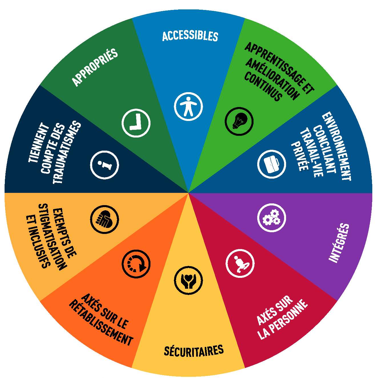 Ce cercle est divisé en 10 segments. Chaque segment représente 1 des 10 dimensions critiques qui définissent les soins de santé mentale de qualité pour les patients et les fournisseurs. Dans le sens des aiguilles d'une montre à partir de 12 heures, les dimensions sont : Accessibles, sur un arrière-plan bleu clair et illustré par un icône d’un personne.  Apprentissage et amelioration continus sur un arrière-plan vert et illustré par un icône d’un ampoule. Environnement conciliant travail-vie privée, sur un arrière-plan bleu moyen et illustré par un icône d’un porte-documents. Intégrés, sur un arrière-plan violet et illustré par un icône des engrenages. Axés sur la personne, sur un arrière-plan rouge et illustré par un icône d’un personne en rotation. Sécuritaires, sur un arrière-plan jaune clair et illustré par un icône des mains autour d’un coeur. Axés sur rétablissement, sur un arrière-plan orange et illustré par un icône d’un flèche rotative. Exempts de stigmatison et inclusive, sur un arrière-plan jaune foncé et illustré par un icône des mains jointes en forme de couer. Tiennent compte des traumatismes, sur un arrière-plan bleu foncé et illustré par un icône d’i minuscule, associé avec l’information. Appropriés, sur un arrière-plan vert foncé et illustré par un icône d’une coche.