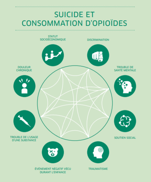 Sur un fond vert clair, on lit le titre, « Suicide et la consommation d’opioïdes ». Sous le titre se trouve un cercle vert foncé traversé de lignes blanches qui relient les cercles vert foncé qui entourent le plus grand cercle, comme des chiffres sur une horloge. Chaque petit cercle vert foncé contient une icône blanche. En commençant en haut à droite et en se déplaçant dans le sens des aiguilles d'une montre autour du plus grand cercle vert, nous voyons : - Discrimination (icône : main blanche avec un doigt pointé vers vous) - Trouble de santé mentale (icône : silhouette d'une tête avec de petites bulles entrant et sortant du dos) - Soutien social (icône : chaîne interconnectée) - Traumatisme (icône : silhouette d'une tête avec une cible dans le dos) - Événement négatif vécu durant l'enfance (icône : un ours en peluche avec un X à la place d'un œil) - Trouble de l’usage d’une substance (icône : seringue) - Douleur chronique (icône : silhouette d'une personne avec des éclairs autour de la tête) - Statut socioéconomique (icône : ligne graphique orientée vers le haut avec deux silhouettes le long de la ligne, comme si la ligne graphique était un ensemble d'escaliers que les silhouettes montent)