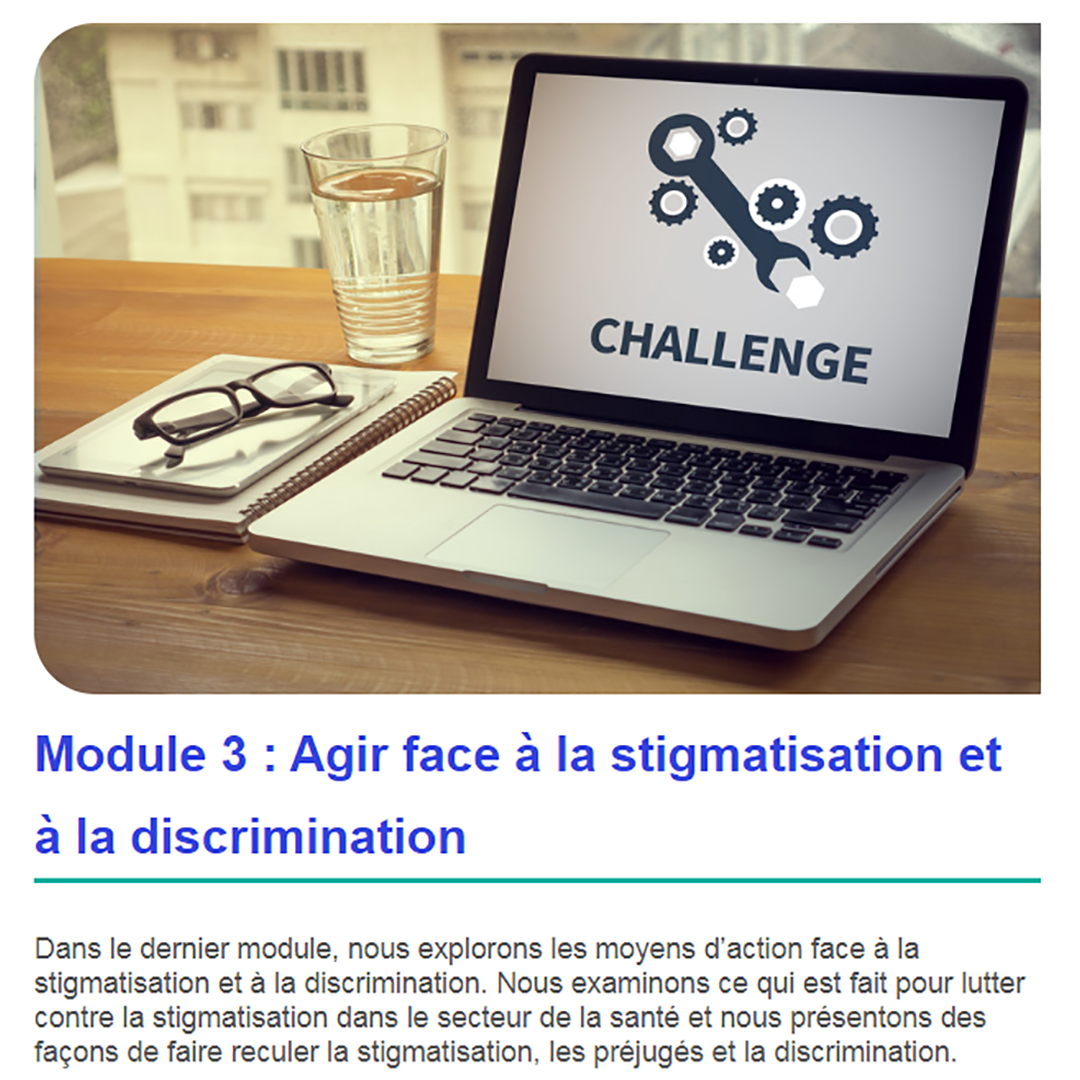 Une capture d'écran du module 3 du programme en ligne "Comprendre la stigmatisation". Le module 3 est "Agir face à la stigmatisation et la discrimination".