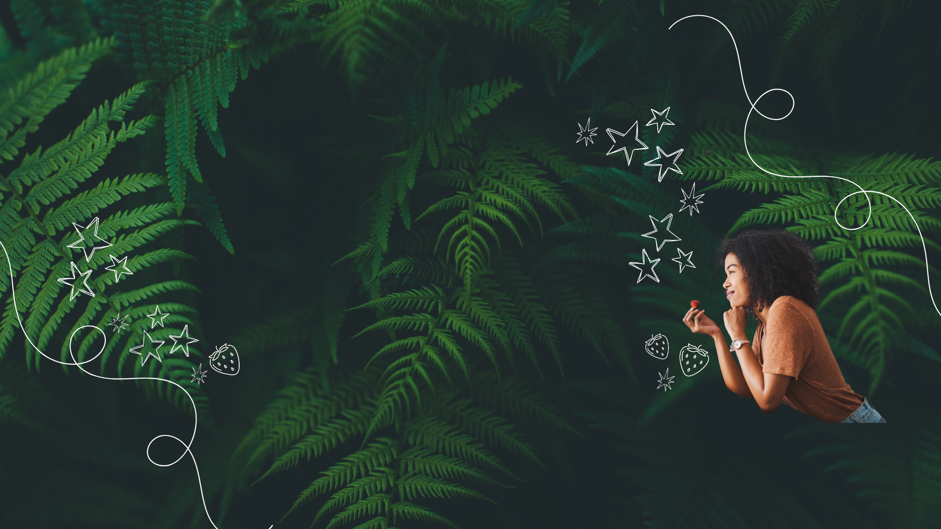 Woman holding strawberry in front of ferns