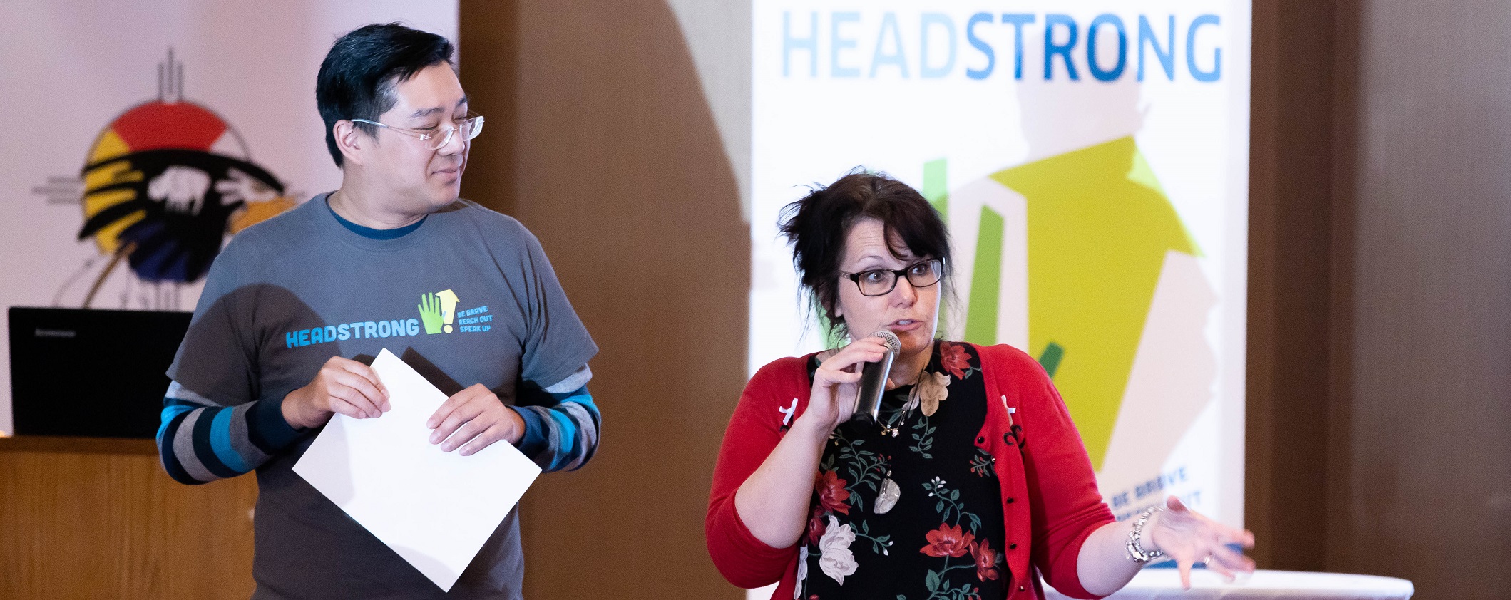 Man and women speaking at a conference